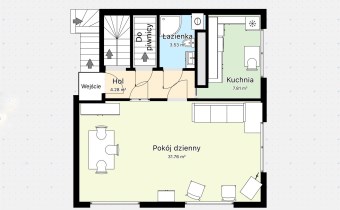 • Parter: Serce domu, w którym znajduje się przestronny salon, jasna kuchnia oraz łazienka. To idealne miejsce na wspólne posiłki i relaks.