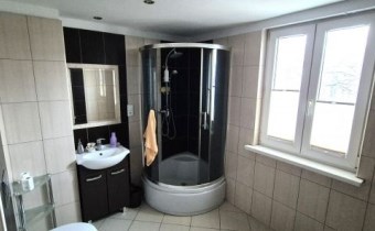 Okna drewniane w łazience pcv; na podłogach deski, panele, wykładzina, w łazience kabina prysznicowa, umywalka, wc; łazienka po remoncie;