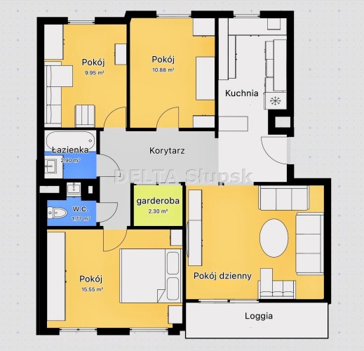 Mieszkanie charakteryzuje się funkcjonalnym, w pełni rozkładowym układem – do każdego pomieszczenia prowadzi osobne wejście z korytarza. W skład lokalu wchodzą: